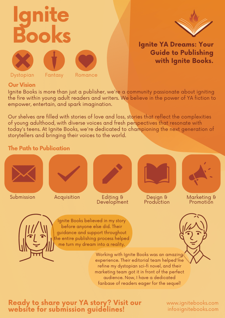 - Success Stories: These highlight blurbs of fictional successful YA authors published by the brand.