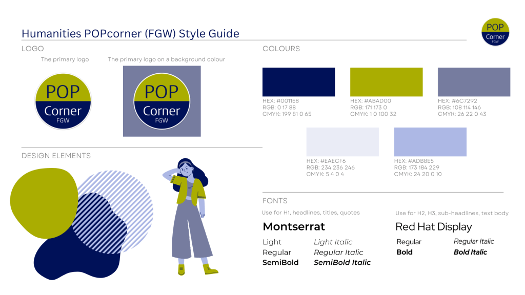 I created this style guide for the Humanities POPcorner’s Instagram and Facebook to ensure a cohesive and professional presence on social media. This guide provides the essential elements that define our visual identity, helping us communicate our brand effectively and consistently.