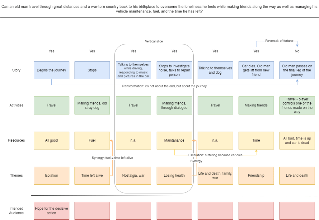 I made this flowchart to show how I would tackle the progression of an imagined game based on the design pillars of said game. The flowchart is based on the Forest Path technique created by Alexander Sword, which uses a “player first” approach to narrative design.